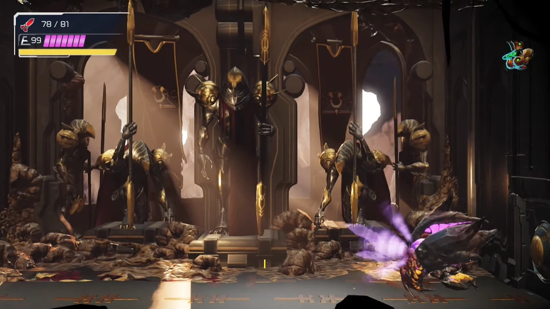 Escue constantemente se halla envuelto en electricidad que lo vuelve inmune contra los ataques de Samus, y en este estado puede atacarla a ella con total libertad empleando sus proyectiles de energía. Por lo tanto, la única forma de que Escue salga de su estado electrificado es esperar a que embista, momento en el que Samus debe esquivarlo para que el jefe choque contra alguna superficie, solo así será vulnerable contra las armas de Samus.