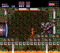 Lo matarás cruelmente e incluso verás cómo se derrite. Ahora ve hacia la izquierda del mapa, hacia una pared con picos. Luego, la pantalla se sacudirá y esa misma pared será derrumbada por el esqueleto de Crocomire. Tranquilo, ya está muerto, su sistema óseo simplemente colapsará y dejará al aire varios recursos que restaurarán tu energía y munición. Prosigue por la izquierda, saltando sobre los bloques encima del ácido hacia otra puerta. La siguiente sala es de forma cuadrada y debes ir por la puerta del suelo. Esto te llevará a otro pozo por el que debes caer hasta tocar fondo y abrir la siguiente puerta del suelo. En la nueva sala, tan pronto como llegues, detona una bomba de energía para reventar todos los obstáculos alrededor. Hecho esto, corre a la derecha y toca pared, luego activa la aceleración y corriendo a la izquierda. Si eres de reflejos rápidos, verás que el camino acaba en cierto punto en una pequeña pendiente; debes realizar un salto giratorio justo en esta pendiente, y con la energía de la aceleración en activo, para así alcanzar una considerable altura que te guiará hacia una puerta en lo alto.