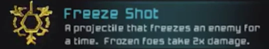 | “ | Proyectil que congela temporalmente al enemigo y dobla el daño que recibe. | „ |
