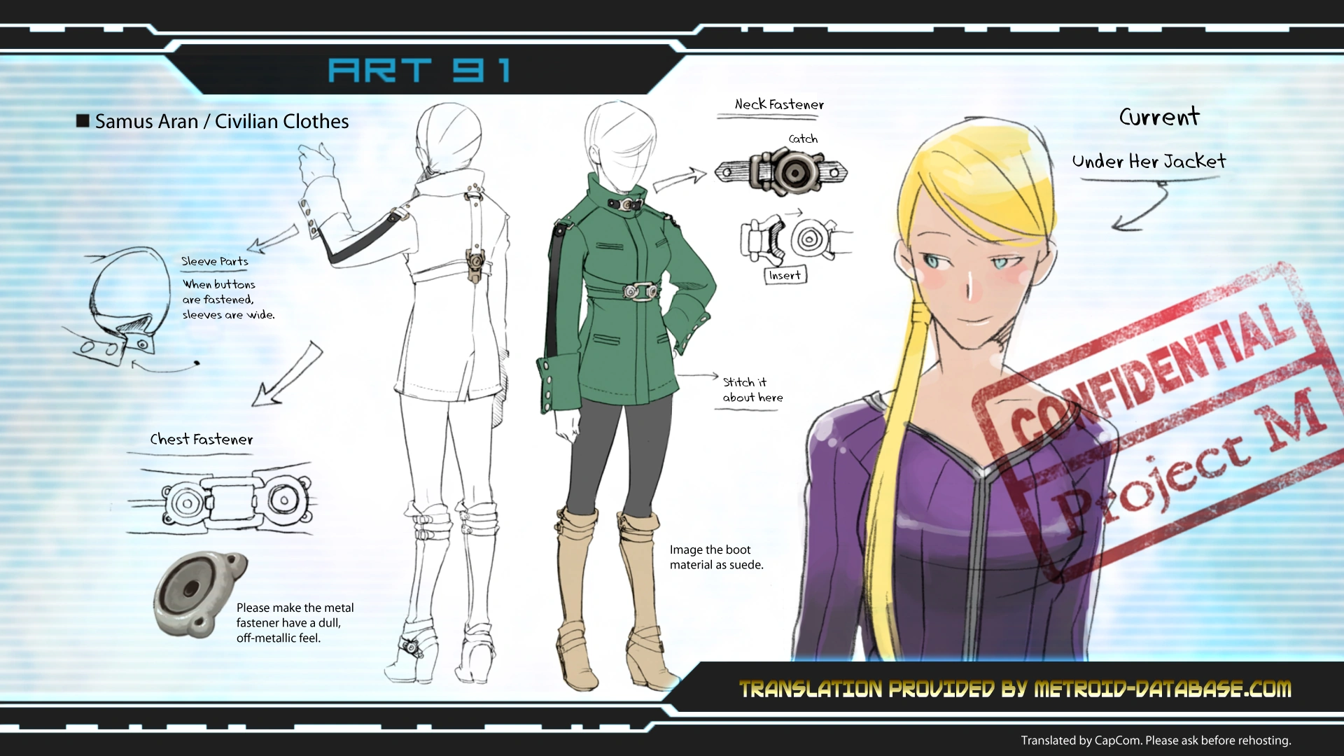 - Por lo visto en el arte oficial, Samus parece no llevar el Traje Zero cuando utiliza este atuendo, ya que el Traje Zero cubre hasta la clavícula y eso no se presencia en el arte.