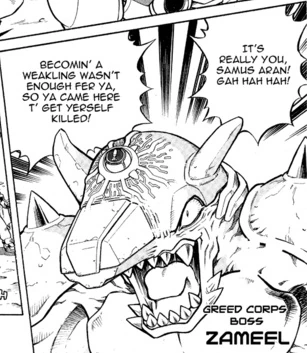 Zameel es uno de los líderes del Cuerpo de Greed, miembro de las Seis Estrellas Mortales. Aparece en el manga Metroid EX: Samus y Joey.