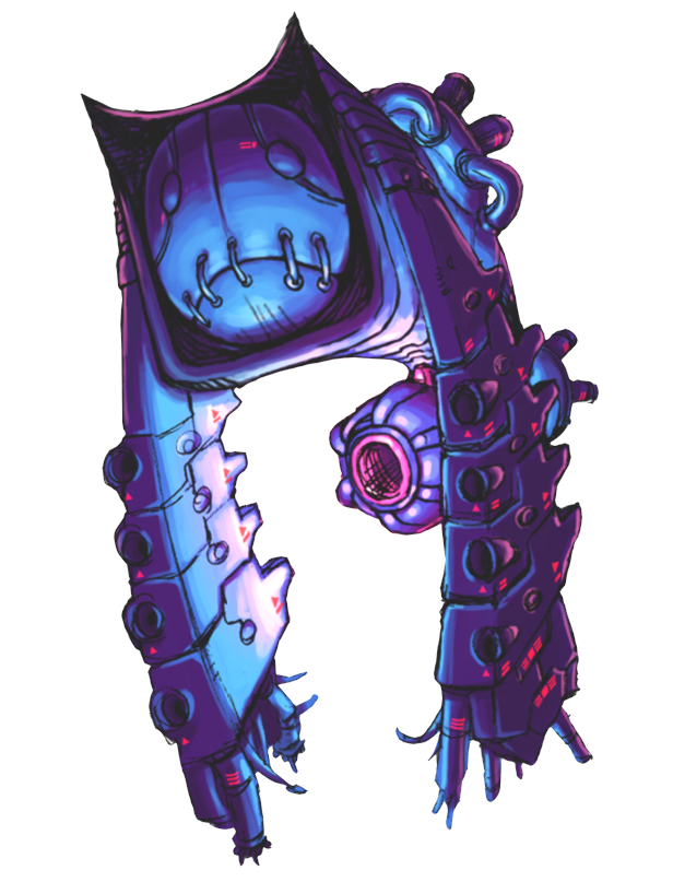 旧銀河連邦軍の一部過激派が極秘裏に開発した半機械生物兵器。生体部位を格納している箱型の外装、先端部からコード類がはみ出している機械製の巨大な腕、重力操作デバイスが付いた尾部で構成された、奇妙なビジュアルとなっている。外装に包まれた生体部は緑色のゲル状の皮膚、6つの眼を持つ奇怪な顔つきをしており、弱点となっている。通常は金属製マスクで生体部を覆い隠し、生体部を保護している。マスクにはつぎはぎの顔のような模様が付いている。