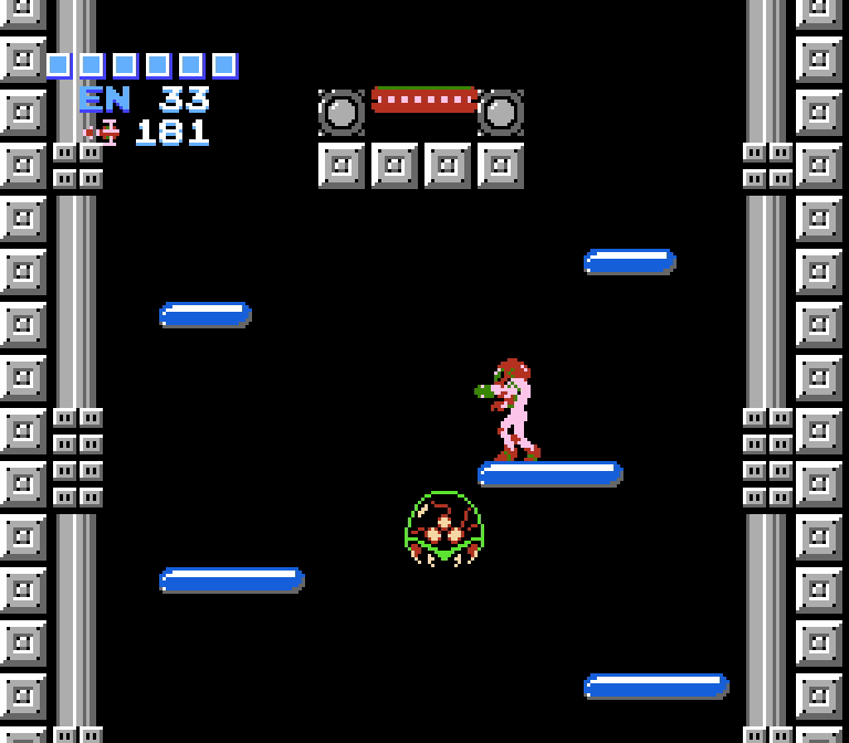 - この脱出シーケンスでは、複数匹の小型メトロイドが空中に浮かんでいる。攻撃行動は取らず、サムスが触れてもダメージを受けないが、障害物となっており、触れるとスペースジャンプが強制解除され落下してしまう。本作のサムスはメトロイドDNAを有しているため、同族と認識され、攻撃されないのだと推測される。