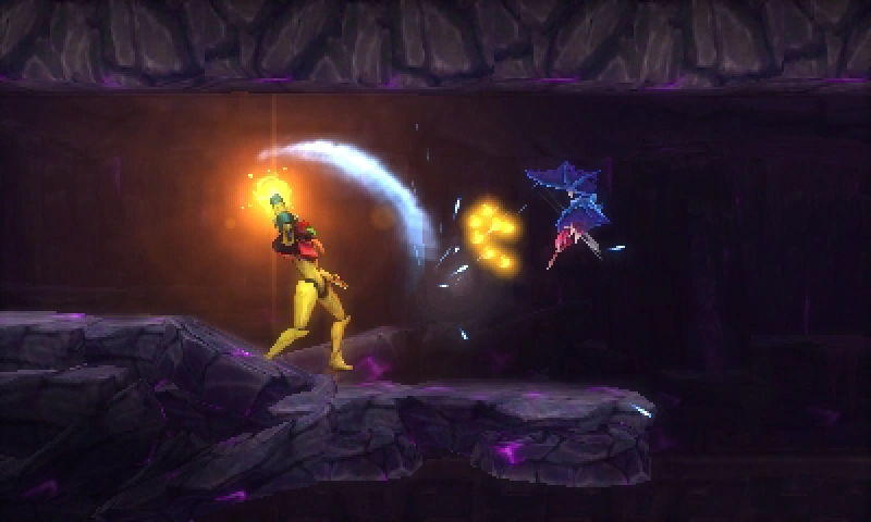 敵の攻撃に合わせてカウンターを決めれば、敵をひるませ強力な攻撃ができる。メトロイド サムスリターンズ 公式サイト