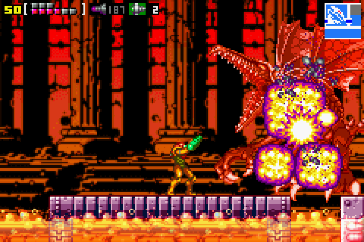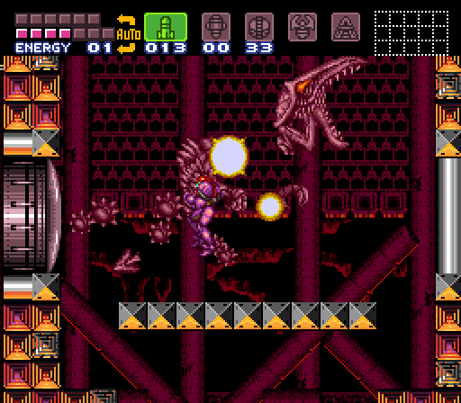 - ミサイルやスクリューアタックなど、サムスの持つすべての武器が有効。地形を貫通する波動ビームを取得している場合は、床下でジャンプを繰り返しつつビームを連射することで、自身の被ダメージを抑えつつ効果的に攻撃することができる。さらにステージの段差付近でボール状態となり、連続して爆弾を設置・爆発させることで、爆風を利用してダメージを与えることが可能。本作の仕様上、ボムジャンプ時にサムスが無敵状態となるため一方的に攻撃することができるが、前述の波動ビームの戦法と比較して時間がかかる。NES版は段差付近が安置となっている。撃破すると新たにミサイル75発を獲得可能。さらにブリンスタ左上部に位置するリドリーの彫像が反応、もう1体の小ボス、クレイドを撃破して両方の彫像を起動させることにより、惑星中枢のツーリアンへと続く道が開放される。