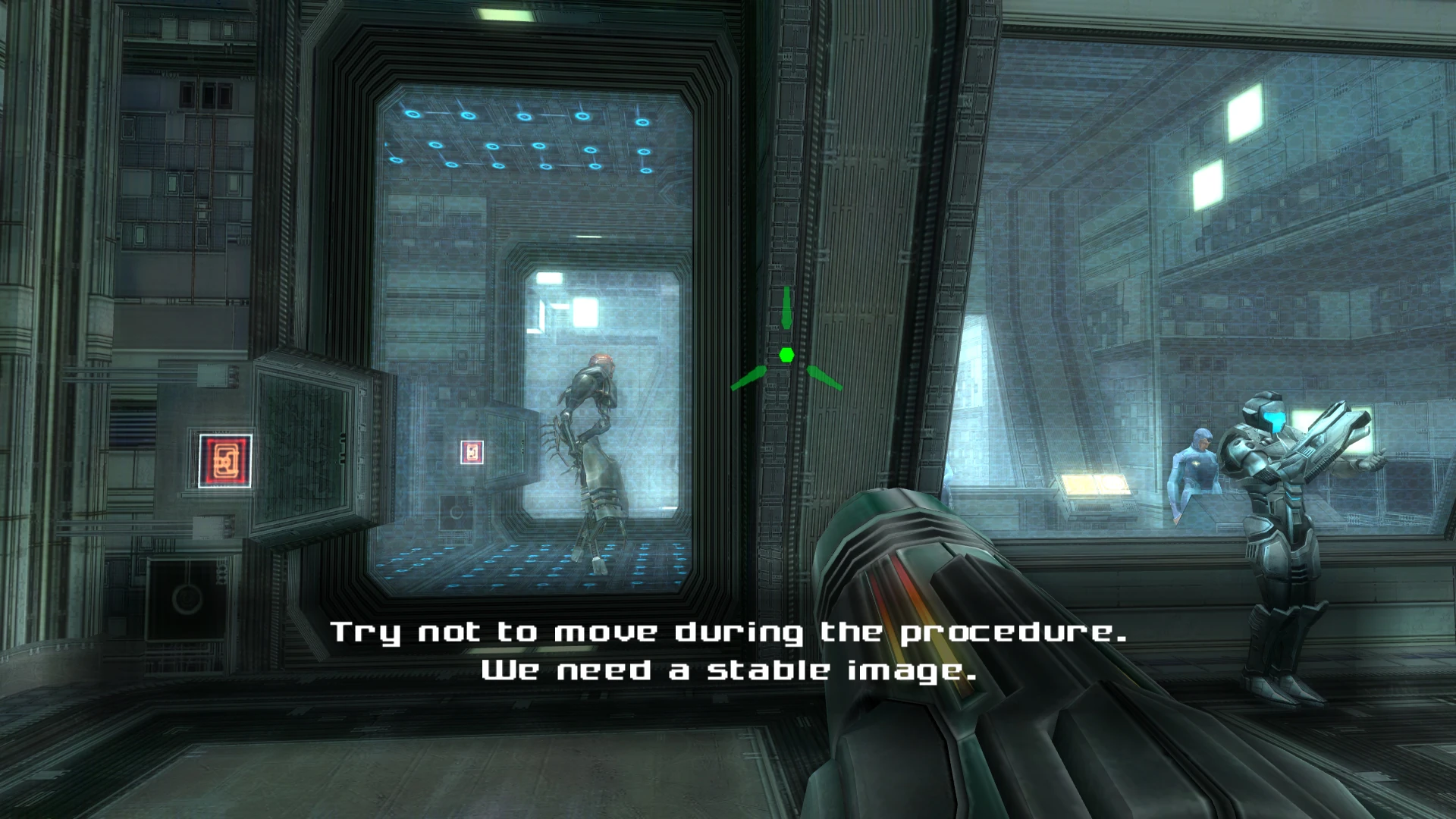 Интересно, что в одном из начальных роликов игры Metroid: Other M можно увидеть устройство, проводящее Скан-тест сетчатки 10, которое выполняет те же функции, что и сканер в изоляторе Пункта Досмотра. Однако здесь это устройство не изолировано от внешнего мира - вместо этого перед ним находится карантинный тамбур, а за ним - запертая дверь, открываемая после успешного прохождения сканирования сетчатки. Очевидно, что таким образом обеспечивается безопасность при входе в Зал заседаний.