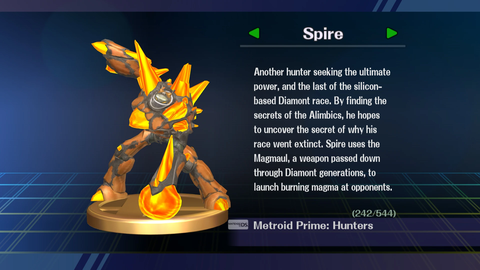 "Еще один охотник, который ищет Непревзойденную Мощь, да еще и последний из кремнийорганической расы Диамонтов. Он надеется, что раскрытые им секреты Алимбийцев помогут ему раскрыть секрет исчезновения его расы. Спайр вооружен Магмолом, оружием, что передавалось из поколения в поколение Диамонтов, оружием, бросающимся в противника горящей магмой."