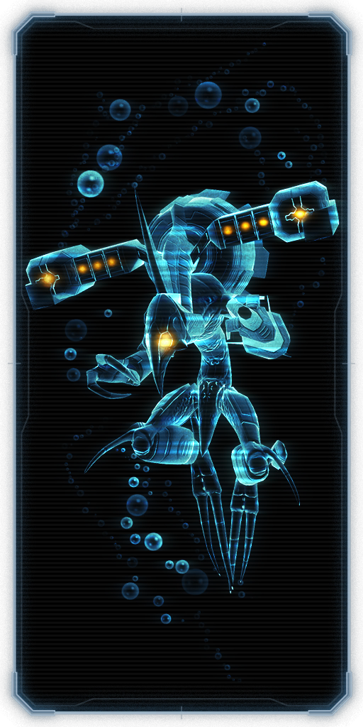 An Aqua Pirate is a Flying Pirate adapted for underwater combat. It has an aquatic jetpack, and has the same attack patterns as the Flying Pirates do, complete with the suicide strike attack it commences once critically injured or when the jetpack malfunctions. Like the Flying Pirates, the Aqua Pirates have jetpacks that produce a great amount of heat, so using the Thermal Visor is key to killing them quickly. Using the Wave Beam prevents them from performing their suicide strike. The only difference besides being underwater is that it is slightly slower and lacks their modified Galvanic Accelerator Cannon that the Flying Pirates usually equip. In addition, if they are defeated with the Wave Beam or the Wavebuster, the Aqua Pirates will simply float around and harmlessly explode without even commencing the suicide strike. Aqua Pirates only appear in Metroid Prime. This suggests the Space Pirates either see no further use for them, or find them inadequate in combat and cease pursuing the idea. It is also possible that they may still exist, but the Pirates are unable to deploy them on Aether because of the dangerous wildlife in the Torvus Bog, the only aquatic region on the planet explored by Samus, and none of the conflict during the Leviathan invasion take place in aquatic areas.