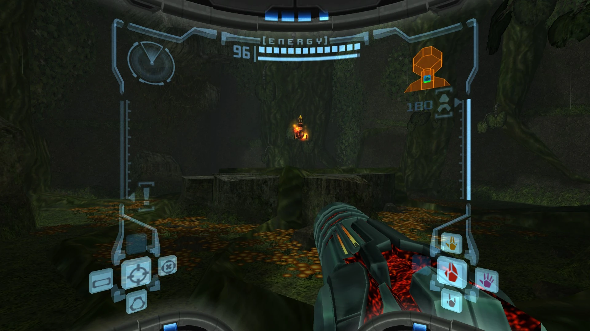 Hundreds of tiny orange-red mushrooms litter the floor; walking in them or shooting them will cause them to release spores into the air.