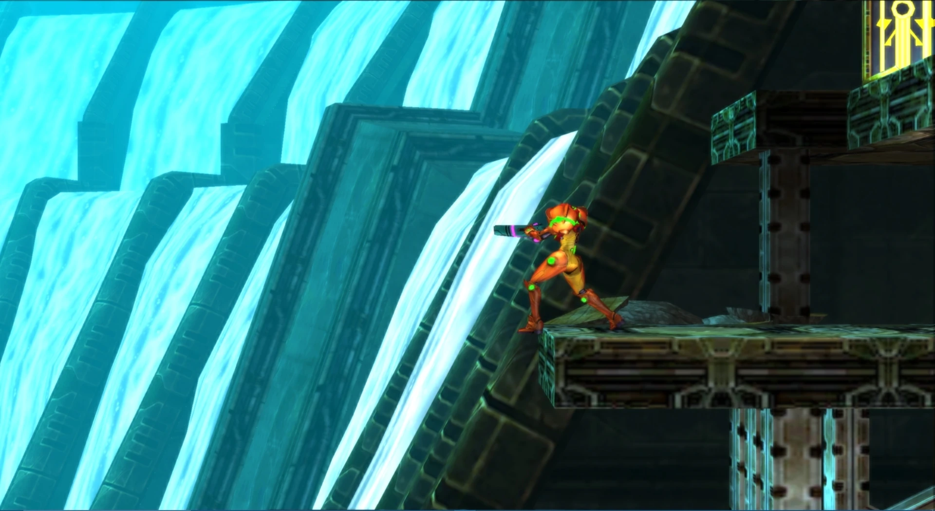 In Samus Returns, the area has been converted into what resembles a hydroelectric power station built around natural caverns filled with water. There are large lava and water streams being held back with Chozo technology in the background. The largest room of Area 2 consists of a large water dam, with artificial waterfalls and many stalactites hanging from the ceiling. Area 2 contains many underground geysers, and there are many large non-hostile creatures that live in the damp caverns. The lowest points of Area 2 contain many volcanoes that are presumably the cause of these geysers.