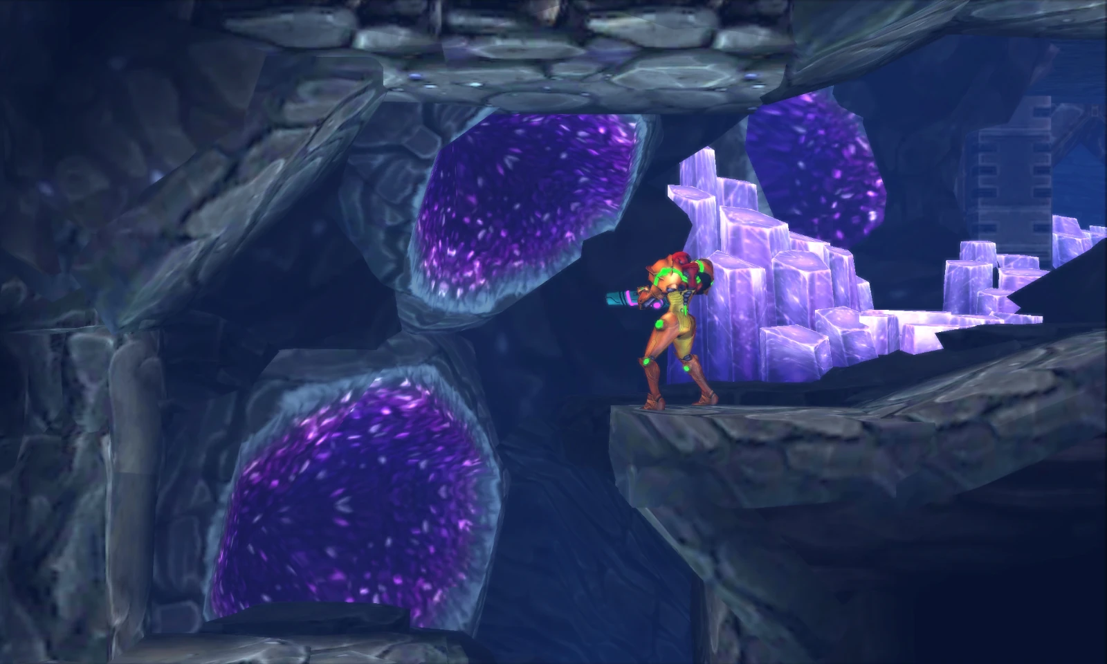 In the remake Metroid: Samus Returns, the two areas are combined and expanded, and now take place in a series of caverns filled with crystals. Some of these crystals can even be seen walking around in the background. The Spazer Beam, Space Jump, and Super Missile are all acquired here. After the first Gamma Metroid is killed and Samus drains the purple liquid via a Chozo Seal, she will come across a second Chozo Seal requiring the destruction of three more Metroids, somewhat similar to the later Area 6.