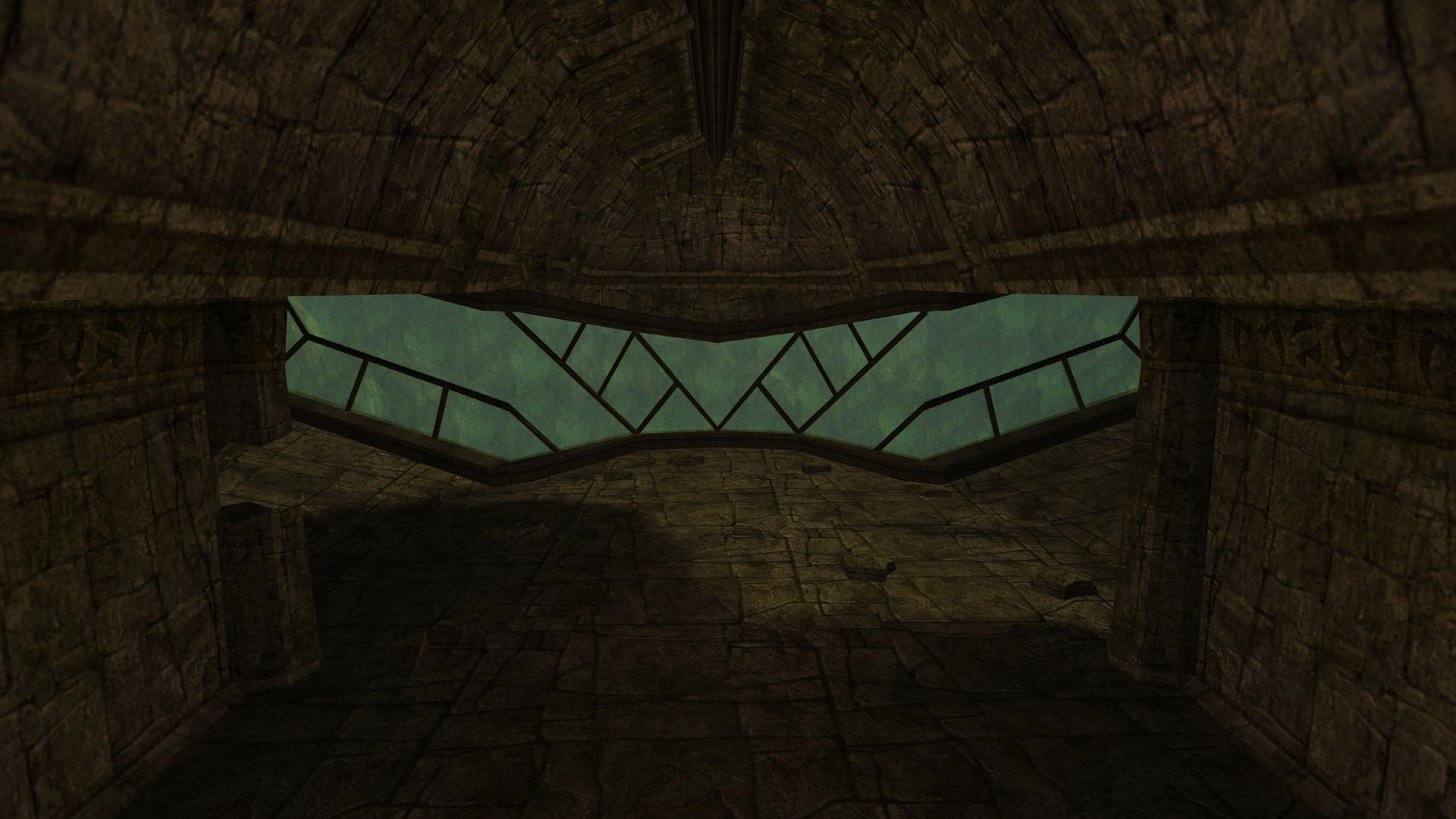 The top of the room curves out in paths leading left and right. The right corridor leads to indestructible debris, while the other corridor leads outside of the shelter to the main portion of the temple. On the top floor, the Chozo Lore entries "Binding" and "Statuary" can be scanned in the NTSC GameCube version of Prime, but they are replaced with the entries "Prophecy of Light" and "Contain" in subsequent versions of the game. In the middle, a green visor-like window reveals the temple outside.