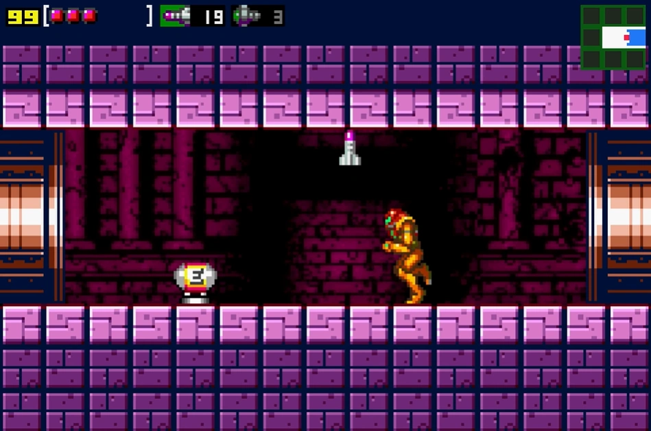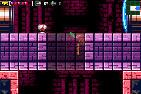 In Zero Mission, the bricks in the upper half of the room now have a smoother, mauve and purple appearance, and the drop is concealed behind an illusory floor. The raised section at the bottom of the (shorter) shaft is now a dark pink, with parts of the walls being purple. The lava is also absent. Unlike in the original Metroid, there is no door on the bottom right, and it is possible to get back up to the top of the shaft via the Turbo Bomb and (later) the Space Jump. It is also possible to grab the upper ledges, making it much easier to go across the top floor of this room.