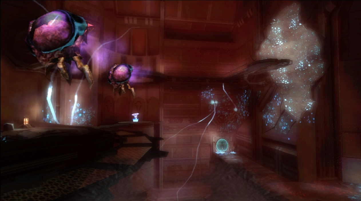 This is a large open room that once housed the flagship's Aurora Unit. This chamber now contains the shattered remains of Aurora Unit 313's stasis tank, with massive damage to the room left behind. Some surfaces ooze with Phazon markings and pulsating Phazon tendrils. A big gaping hole into deep space can be seen above the back of the Aurora Unit's podium, which leaves this room fully depressurized as a result. This hole was left behind as the Aurora Unit was forcefully ripped from its position by Space Pirate forces. A massive pitfall is also present within this room.