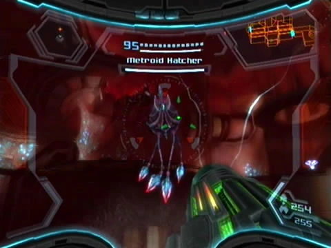 Samus battles the Metroid Hatcher in the Aurora Chamber.