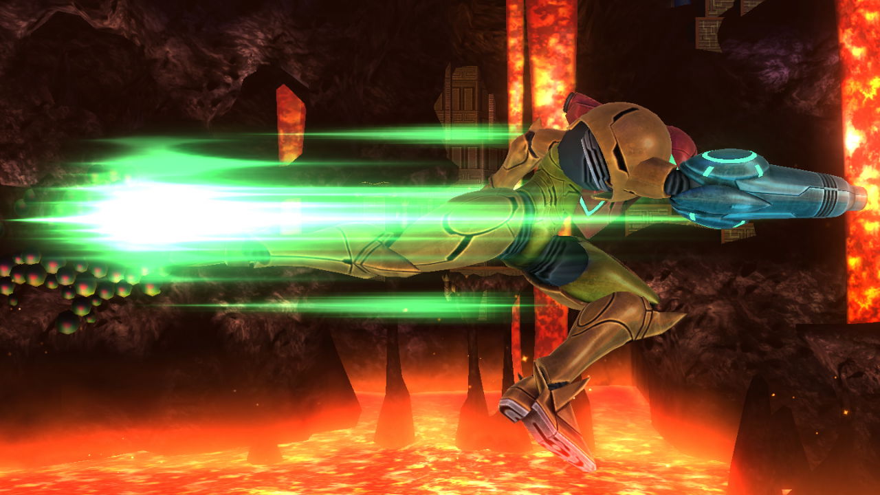 Samus's Back Air Attack, the Flying Back Kick[2] (ソバット)[3], is a fast kick with decent range, and a strong finisher. It deals 14% damage with a clean hit, and 10% with a late one in the first three games. In Super Smash Bros. for Nintendo 3DS and Wii U, the move now deals 14% with a clean hit from Samus's foot, 12% from a clean leg hit, and 9% from a late hit. It is an excellent move to KO opponents under 100% damage. Dark Samus's Back Air Attack is virtually identical.