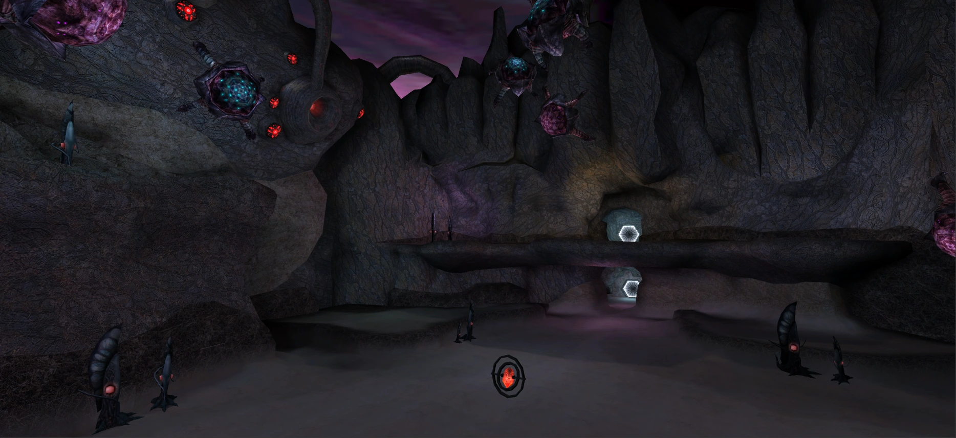 This is a large and spacious room comprised of two different elevations. The bottom floor contains much sand with flat surfaces and Ing biology. The top floor contains a few ledges spread apart from each other. There does not appear to be a way to reach the top elevation from the bottom floor. This room houses much Ing presence, such as a large amount of Bladepods, a few Ingclaws on one side of the room, and multiple Warrior Ing. This room also uniquely houses two types of wall growths situated high above the walls in both purple and turquoise colorations; it is unclear what these are exactly. Large Ingworm-like structures can be seen residing in room's ceiling areas, creating red-hole crevasses on the walls. Some structures contain or are near red eye cores.