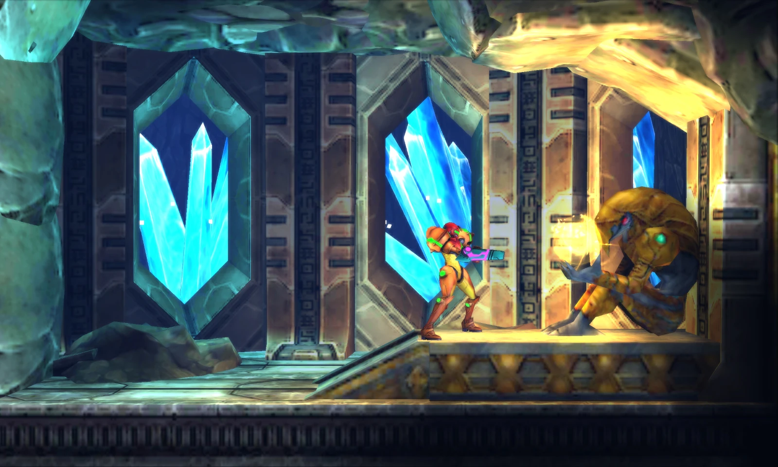 These orbs appear throughout SR388 in Metroid: Samus Returns, and are generated by dispensers resembling a pair of miniature Chozo Statues. After power-ups and Aeion Abilities have been collected, Big Aeion Orbs will permanently replace them in the hands of Chozo Statues and the mouths of Aeion Ability Artifacts, respectively. When collected by Samus, a Big Aeion Orb is fully absorbed and disappears, although it regenerates after a short time.
