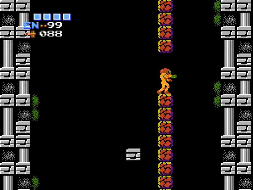 In Metroid, this is a very tall shaft constructed from grey and black blocks of rocky materials and brick. It is challenging to ascend, as only a few small midair platforms exist in the shaft and are too far apart for Samus to reach even with the High Jump Boots. To ascend the shaft, she must make use of a large column of Fake Blocks by shooting some out, and jumping repeatedly. She can continue gradually shooting blocks above her, and jumping before those below her regenerate, to climb the shaft. At least four solid platforms are positioned along the column for Samus to jump to if she needs a break, or as insurance in case a block regenerates over her. When this happens, Samus takes damage and is knocked back, potentially sending her falling to the base of the shaft. Once at the top of the column, Samus can exit into a door near the apex of the shaft, leading back to the elevator.