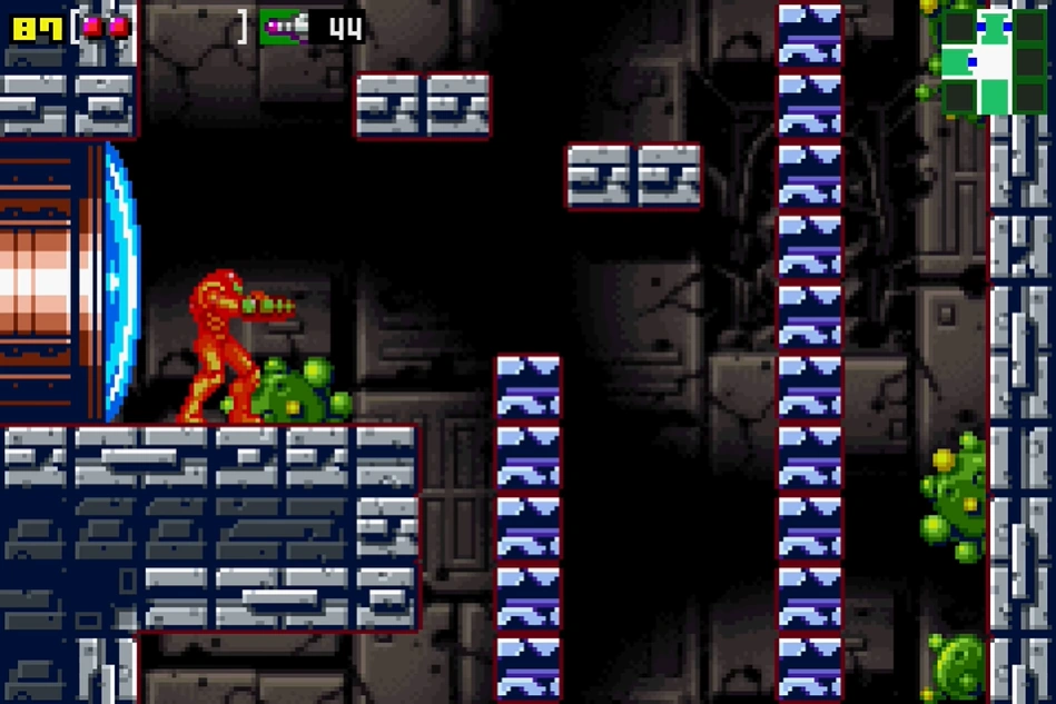 In Zero Mission, the room is shorter in height, but more or less serves the same purpose. Ascending the shaft is much easier now given the addition of the Wall Jump. Additionally, Fake Blocks no longer damage Samus: when she stands where a block will regenerate, it will repeatedly re-form and then break, and continue doing so until she moves from her position, when it will re-form fully. Assuming Samus collected the Speed Booster, she can also run into this room from the steep slope at the base of the lair, through a barricade near the bottom, and Shinespark up through the block column.