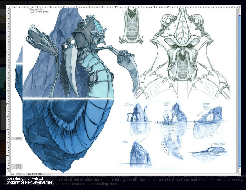 Boss Creature, also labeled as boss design for Metriod[sic], is an unused boss in concept art from Nelson "Dedos" Garcia and "Xochitl" of Next Level Games. This artwork was created for "Phase 1" of Project Valkyrie, a PvP Metroid Nintendo DS game that was shelved when Nintendo asked Next Level Games to make Luigi's Mansion: Dark Moon.