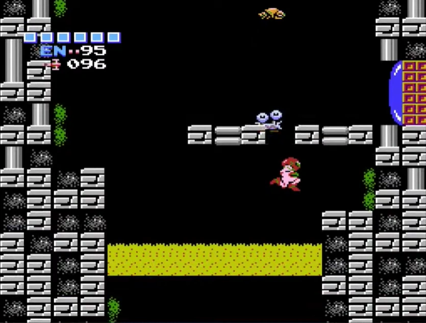 In Metroid, the shaft is comprised of grey and black blocks, the latter of which appear to be made of rock, and pillars. The walls are lined with green bushes. Only two ledges and two platforms exist in the initial shaft, along with a pool of fake acid below. Through this is a longer shaft filled with multiple Rippers. Unless Samus has the Ice Beam and can carefully freeze and use the Rippers as platforms, it is difficult to re-ascend the shaft. At its bottom is a single midair platform, a ledge on the right wall, and a floor above an inaccessible pool of real acid. The door at the base of the shaft leads toward Kraid's room.
