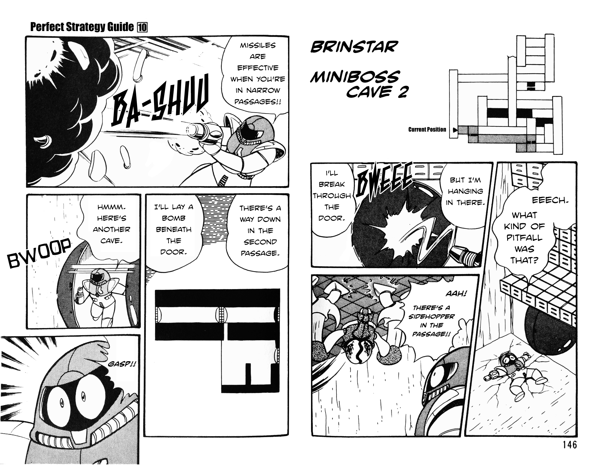 In Victory Techniques for Metroid, Samus rushes into this room and begins to fall, but sees "water" (acid) below and assumes she is saved. Comically, she falls through the acid and lands in the floor, leaving an impression in it.