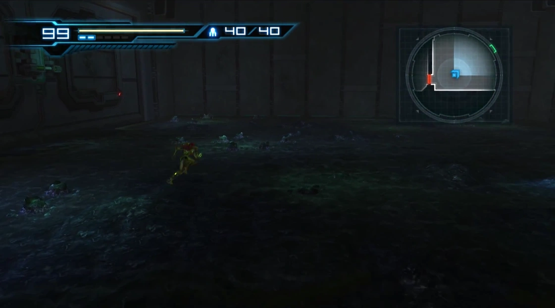 The floor is covered in the Queen Metroid's amniotic fluid, with at least seven hatched Metroid Eggs scattered around. The Queen Metroid steps on and crushes some of them as she emerges from the cage. Later, when Samus is able to freely explore the cage, she finds many more hatched eggs toward the back of the room. Aside from a lined pattern on the walls, the breeding cage contains no other noteworthy features.