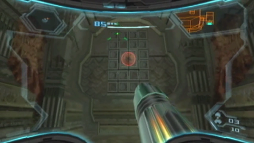 Bryyo Lore Locks (as named in the game's internal files) are an ancient locking system used to guard certain Bryyo Data entries in Metroid Prime 3: Corruption. A Reptilicus invention, the locks take the shape of a series of squares with circular indents in them. The largest of these circles is in the center, and glows with red light. To deactivate the mechanism, Samus must shoot at the red part, and then at three smaller red circles that appear in other (random) indents. These must be shot in succession to unlock the puzzle or else it will undo itself. When the puzzle is unlocked, the Event Jingle will play. These locks were placed on certain entries in the quest of the prophetess to disseminate the final words of the last Lord of Science before both met their deaths at the hands of the Primals.