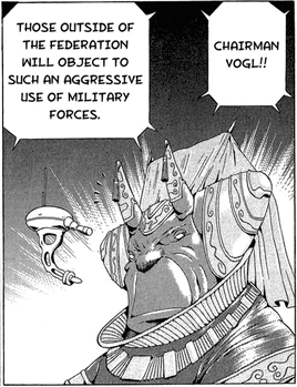 "Ceratopsids" are a race of horned humanoids. Chairman Vogl is a member of this species, as well as a younger member that is seen bullying Damara and a fellow student he dubs "Potato" or "Potato Farmer". They have two horns protruding from their foreheads, and pointed ears not unlike that of an elephant. Vogl's ears are obscured by a ceremonial headdress that he appears to wear in his capacity as chairman.