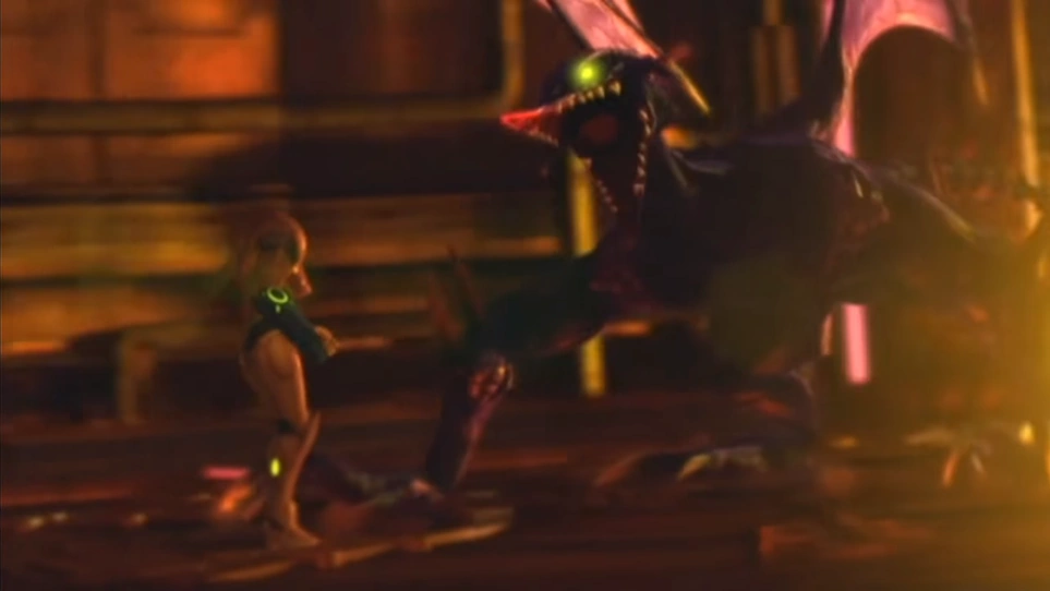 - Samus makes a vocalization as she confronts Ridley at the end of this cutscene, which differs between the English and Japanese versions. In the Japanese version, she screams a warrior's cry, while in English it is a softer grunt.