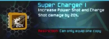 Federation Marines in Metroid Prime: Federation Force carry weapons that have charging functions similar to the Charge Beam. The only differences are that it takes longer to charge compared to Samus's Charge Beam, that their Mechs move very slowly with a fully charged Beam, and that strong breakable objects cannot be destroyed unless the shot is fully charged. The Super Charger MOD increases the damage output of uncharged shots and charged shots by 20%, 30%, or 50%. Only one copy of it can be equipped at a time.