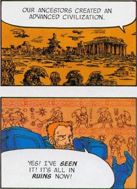 Many of their structures were built of stone, although it is clear they were capable of using far more complicated materials and building techniques. This is most prevalent in the crafting of their statues, which seem to be present in all Chozo colonies. This art form was considered to be a sacred process, reserved only for those Chozo who had lifetimes of experience in such things.[5] They also used illustrations similar to Ancient Egyptian art to depict aspects of their culture.[6]