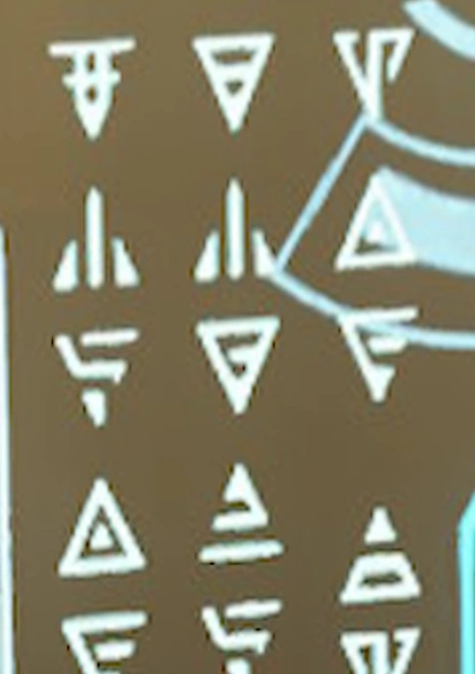 The characters take the base form of a triangle with various angular runic patterns. When formed into words and sentences, every other character is mirrored vertically, with the first character in a sentence typically pointing down. They can be read and written left-right or top-bottom.