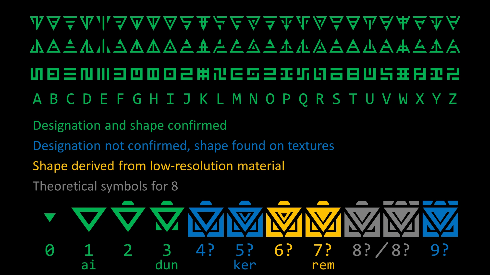 Chozo alphabet in its two known forms: the square form is found on Zebes, and the triangular form is found on ZDR.