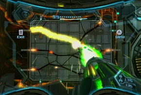 Samus welds together a broken Circuit board with the Nova Beam.