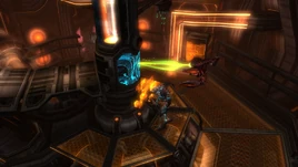 This room is notably the location from which the defense system is generated and controlled, across the rest of the facilities on the Homeworld. It is a fairly tall room, with a central column that stretches from the floor to the ceiling. This column is the main part of the Shield Generator. The only apparent method of ascent here is via many platforms positioned on the wall and the central column that lead up the room. These platforms allow personnel to interact with the various levels of the Generator. There are three sections positioned at the bottom, and middle parts of the column. These sections are hollow and each contain three energy cores. These cores provide power to a trio of revolving shields around a Bomb Slot at the room's top. A layer of Phazite protects each of these sections. The Phazite itself is protected by an additional layer of metal, although these can be retracted by use of a terminal at the top of the room (opposite the Bomb Slot). The Phazite panels serve a double purpose; they prevent access to the energy cores and seal them inside, and also allow Pirates to access them remotely using high-frequency beams for calibration and repairs.