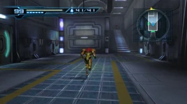 When Samus enters the room for the first time, three Reos rush in from the restroom door, which locks until they are defeated. It then remains empty of enemies for the rest of the game. As with the rest of the Main Sector, the hall is dark and lacks electricity. As she approaches the upper door, it locks until she uses a Terminal beside it to reopen it. During the escape sequence at the end of the game, the room will begin to explode as Samus reaches the door to exit when she is passing through.