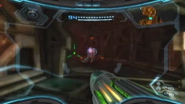 Control Room Access is a hallway that connects the Aurora Chamber and the Control Room. On the former end, air rushes out into the ruined Aurora Chamber, hindering Samus's entry. Upon first entering the room, a Phazon Metroid can be seen carrying a dead Pirate Trooper, but drops it upon sight of Samus. The Pirate corpse will quickly disintegrate.