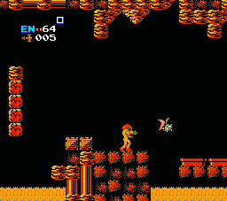In Metroid, Corridor No. 5 consists of gold rocky terrain, several pits of acid, and Air Holes that spawn Zebs. The Air Holes are often clustered between large blocks of rocky material, although two Air Holes are positioned above one of the pools of acid. A Missile Tank is placed on a structure suspended above an acid pit; this is expected to be the first Missile tank that Samus Aran collects in these games (and, by extension, the entire series). Corridor No. 5 ultimately leads to an elevator, which takes Samus into the fire zone of Norfair.