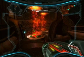 Samus can travel through the acid/waste stream unharmed. In the NTSC version, the rain will cause Samus's Hazard Suit to engage its shielding, although in the PAL and Trilogy versions the shielding will not activate when Samus enters the waste fall. In both circumstances it will impair her vision temporarily.