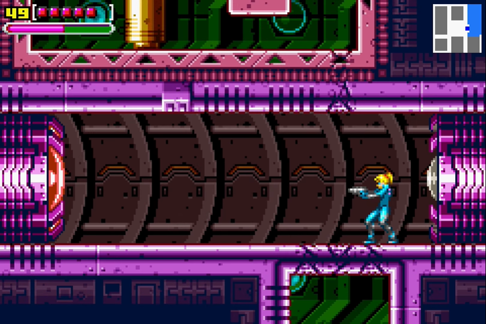 Shortly thereafter, Samus enters the lower part of the shaft via other rooms. The lower shaft consists of two levels, each separated by a large obstruction that can be shot, and leads to a door on the left wall, which is directly underneath the floor with the tunnel. This leads into a room with destructible walls and a shutter. If Samus is detected in the adjacent shaft with searchlights, a Zebesian will follow her into this room; otherwise she is free and clear. After Samus obtains the Fully Powered Suit, she can use her Missiles and Screw Attack to destroy blocks in the floor separating the two halves of the shaft. A Zebesian spawns in front of the middle door on the lower left, and will detect Samus upon entry. Another Zebesian is present above the floor where Samus crawled into the tunnel. A Super Missile Tank can also be obtained (see below).