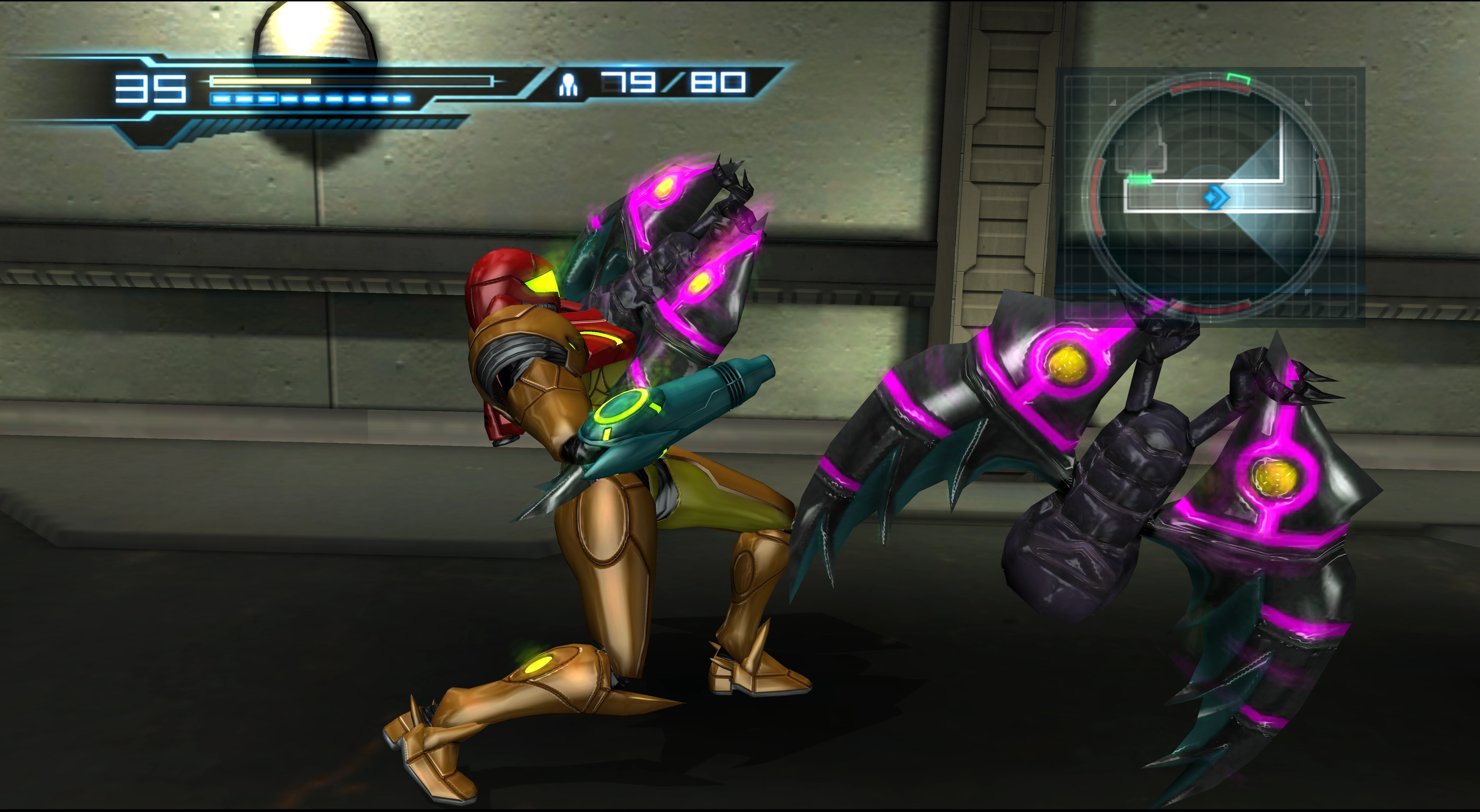Because the Cyclaws are only present in the artificially constructed BOTTLE SHIP, it is possible that these creatures cannot be found in the wild and are actually the result of Galactic Federation scientists modifying Skrees to convert them into efficient bioweapons. It is not fully clear if these creatures are cybernetically enhanced Skrees. Given how they seem to be unaffected by the effects of gravity within Sector 2 / Cryosphere, it is possible that they are incorporated with Gravity Suit technology (possibly hinted by the purple lining on their bodies).