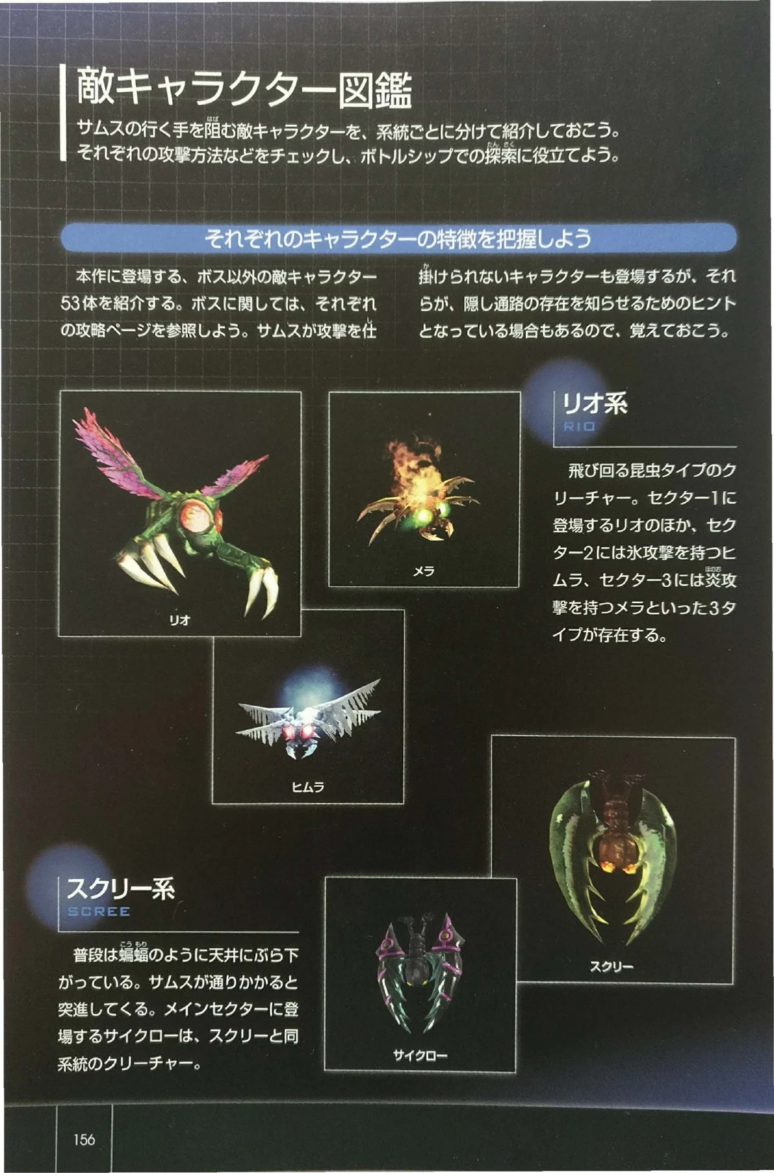 "The Scree series typically can be found hanging from ceilings. As Samus approaches, they will charge. Cyclaws, which appear in the Main Sector, are in the same family as Screes."