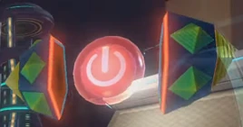 A Cyclon is an airborne robot that float slowly around the area until threatened. It somewhat resembles a Waver or Halzyn, with its core body (a red sphere marked with a power button) floating between a pair of impenetrable shells that protect its sides. Like a horizontal Spore Spawn, these shells can open or close to expose or protect its vulnerable center. When the Cyclon attacks, its armor disassembles into small bipyramid octahedrons that orbit rapidly around the spinning core, generating a tornado as the Cyclon moves towards the Mii players.