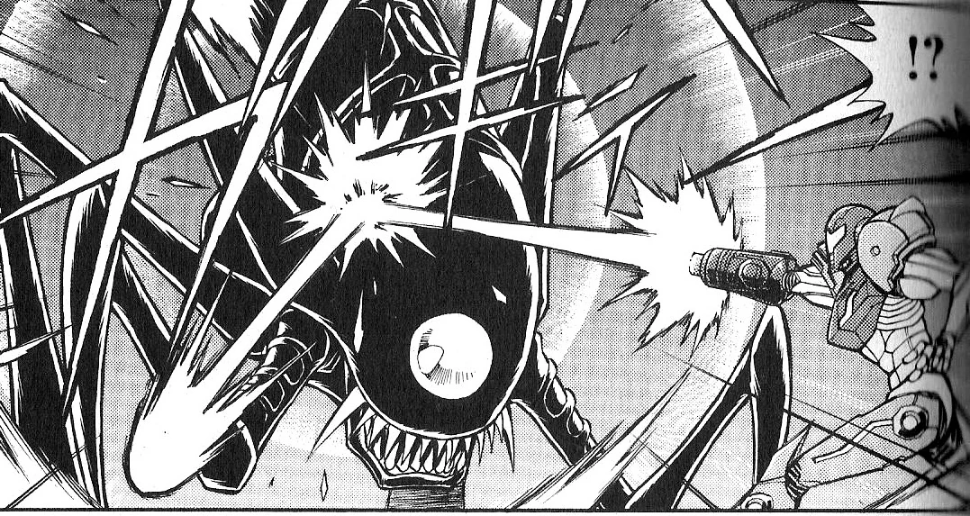 The Dark Alpha Splinter also appears in the Episode of Aether manga, however it was depicted as a far larger creature than in-game, as well as having a body capable of reflecting beams. It was also not fought in the Great Temple, rather, it was seen in a different GFMC Compound than that in-game, and attacked Klaus Schneider until Samus intervened. Klaus urged her to kill the creature before it was possessed by the "black fog", but she was too late, and her weapons were useless until she performed an Overblast. Later, another attacked, and Miguel Luis Garcia assisted Samus in destroying it. The latter Splinter was more in line with the in-game boss.