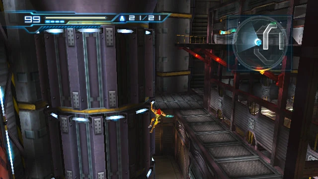 On the top floor, the path turns onto a diagonal walkway leading to a wall. Samus can get to the top of it using a Grapple Point. The wall turns into another path leading toward a large, spinning turbine with several Grab Ledges surrounding it that Samus can grab. By Kick Climbing off the left wall to the ledges, Samus can slowly climb the turbine to a higher platform. Alternatively, she can quickly Kick Climb from the right side of the turbine and the wall underneath the platform to reach the top. A similar puzzle appears in the Sector Generator Room in Sector 2 / Cryosphere.