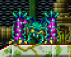 In Metroid Fusion, the X Parasites have infected and mimicked the Dessgeegas that are held within the Biologic Space Laboratories research station, and the former's ability to manipulate the DNA of their hosts has caused the manifestation of several abnormalities. Instead of encountering them in a volcanic habitat, Samus finds them in Sector 2 (TRO), the tropical sector, where the Dessgeegas now feature a green and purple coloration that somewhat blends in with their environment. Additionally, their mandibles have an extra inner spike, and the underside of their feet have thrusters that ignite whenever the creatures jump. The most notable addition, however, can be found on the surface of their legs; not only are they coated with additional thorns, darts will now fly out from the legs' outer sides when the Dessgeegas are struck by weapons.