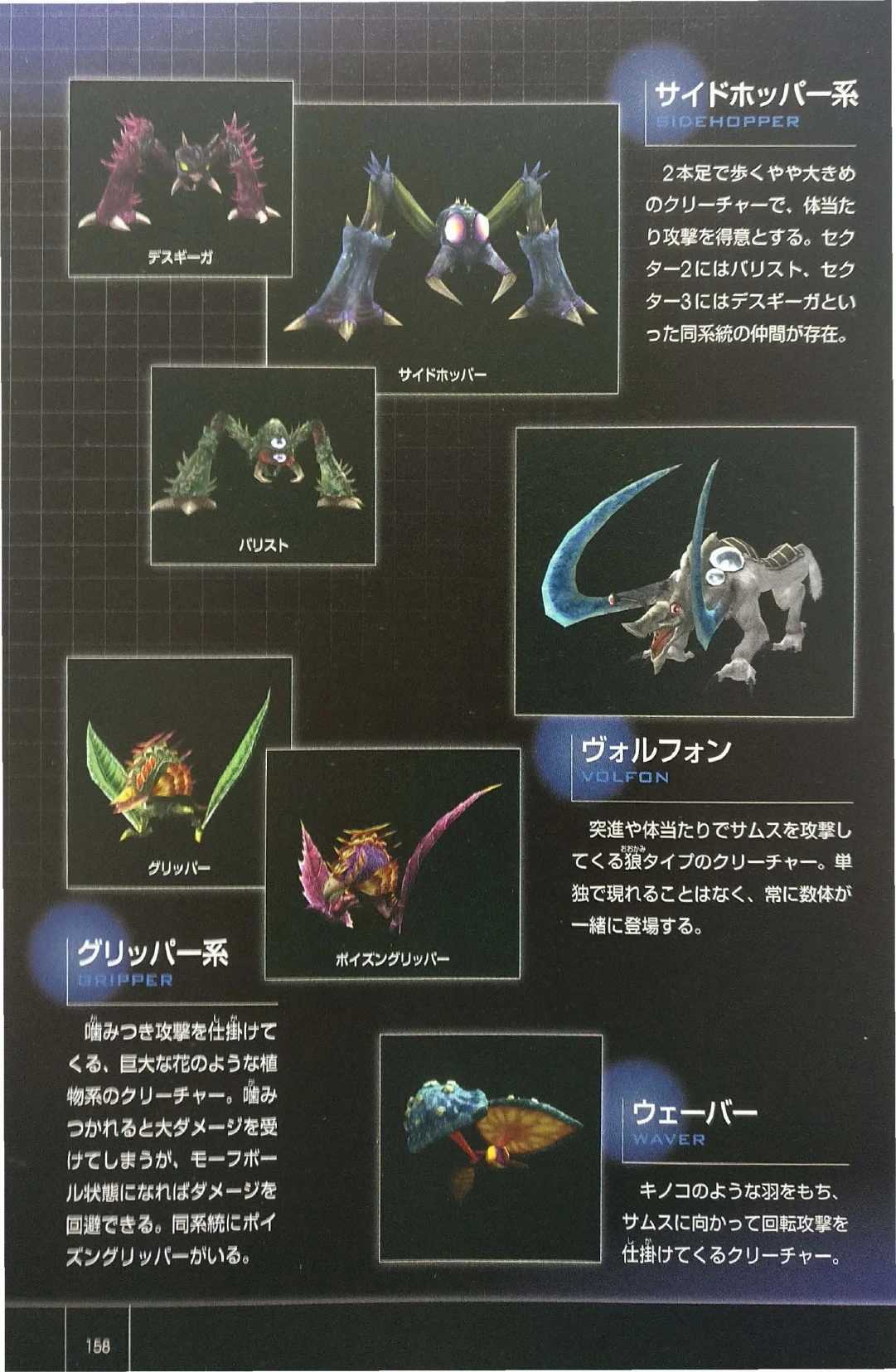 - "These strange bipeds are resilient creatures with one very glaring weakness, their head. Though larger and stronger than you, the Side Hoppers, Dessgeegas, and Barisutes are far slower than you. They stomp around, usually knocking you down or crushing you under their clawed feet, and can chomp at you with their pincers. To destroy them quickly, weaken them with Charge Beam shots and finish them off with Overblast attacks. The Side Hopper is the weakest of the bunch. Dessgeegas are slightly stronger, and Barisutes are the strongest of them all."