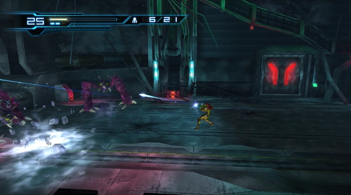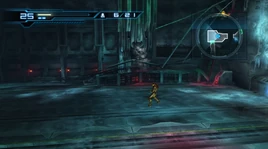 The second part of the room contains another air exhaust and another vent, not collapsed, which leads to a Missile Tank (see below). Another blast door is found on the right wall as well. Samus is forced into a battle with two Dessgeegas here, the only specimens of their kind to be encountered outside of the Pyrosphere during Other M. Defeating the creatures unlocks the door, allowing Samus to continue.